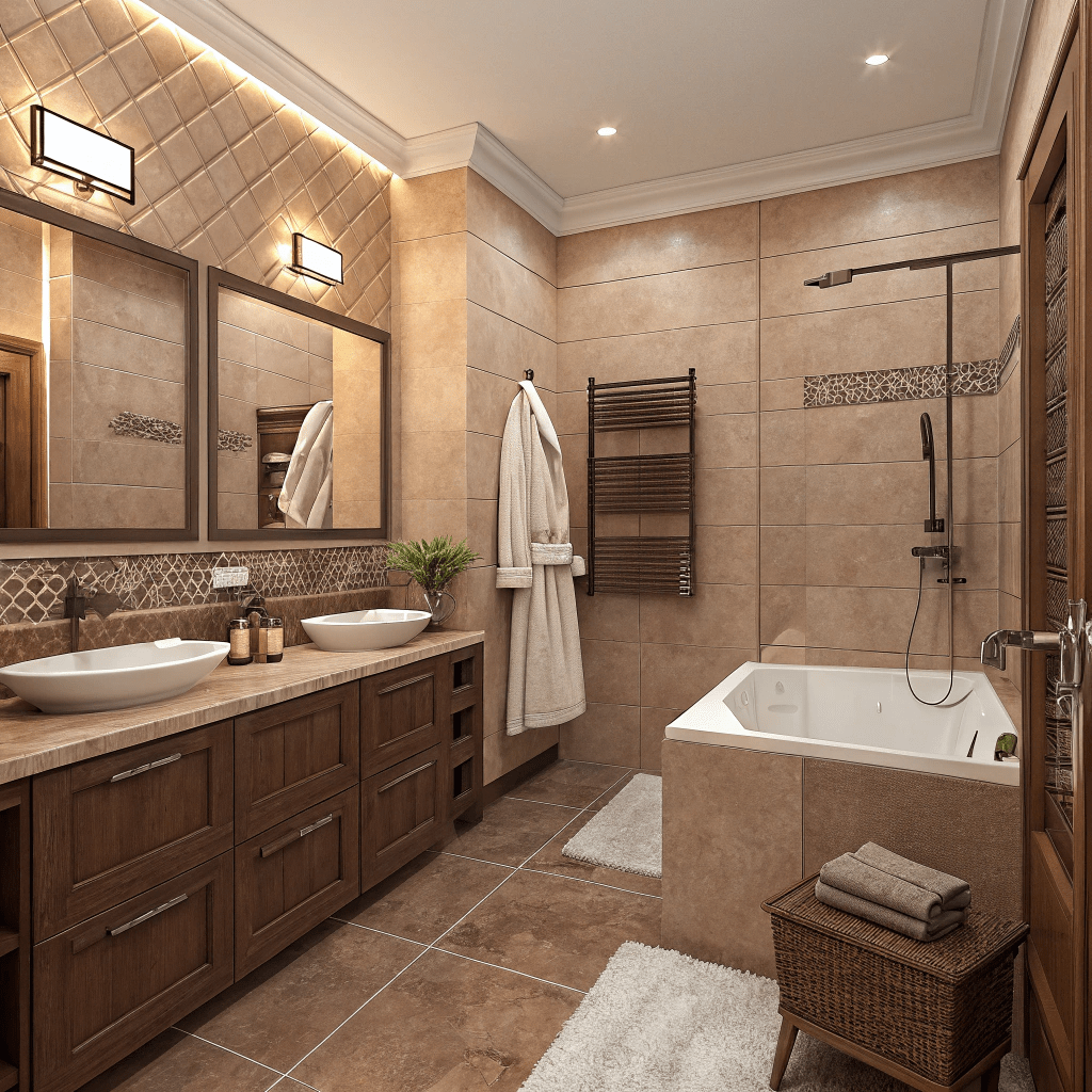 Ciepłe brązy w łazience to doskonały wybór dla osób ceniących elegancję i naturalność. W połączeniu z kamieniem, drewnem lub ceramiką w jasnych odcieniach tworzy stylową przestrzeń.