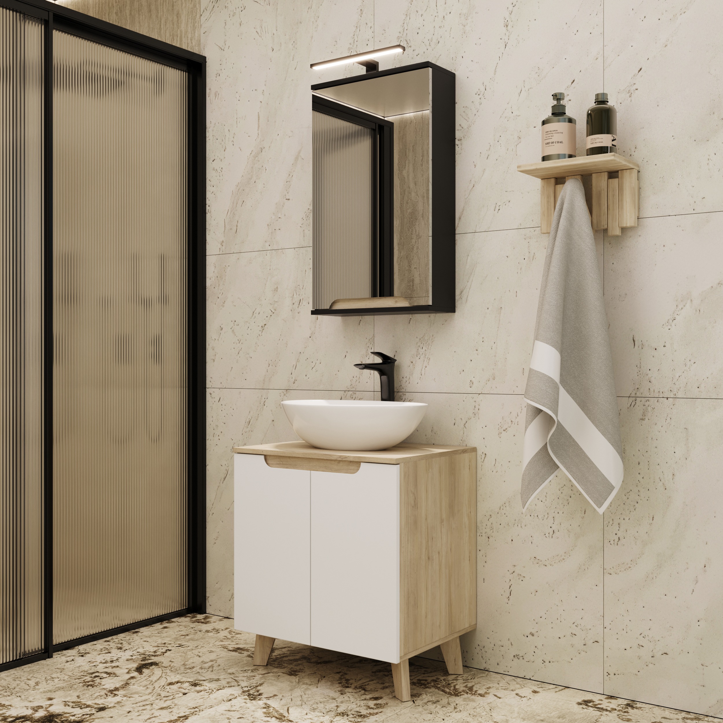 Konstrukcja pozwala zmontować mebel jako szafka pod umywalkę stojąca na nóżkach z naturalnego drzewa albo jako szafka łazienkowa podwieszana.