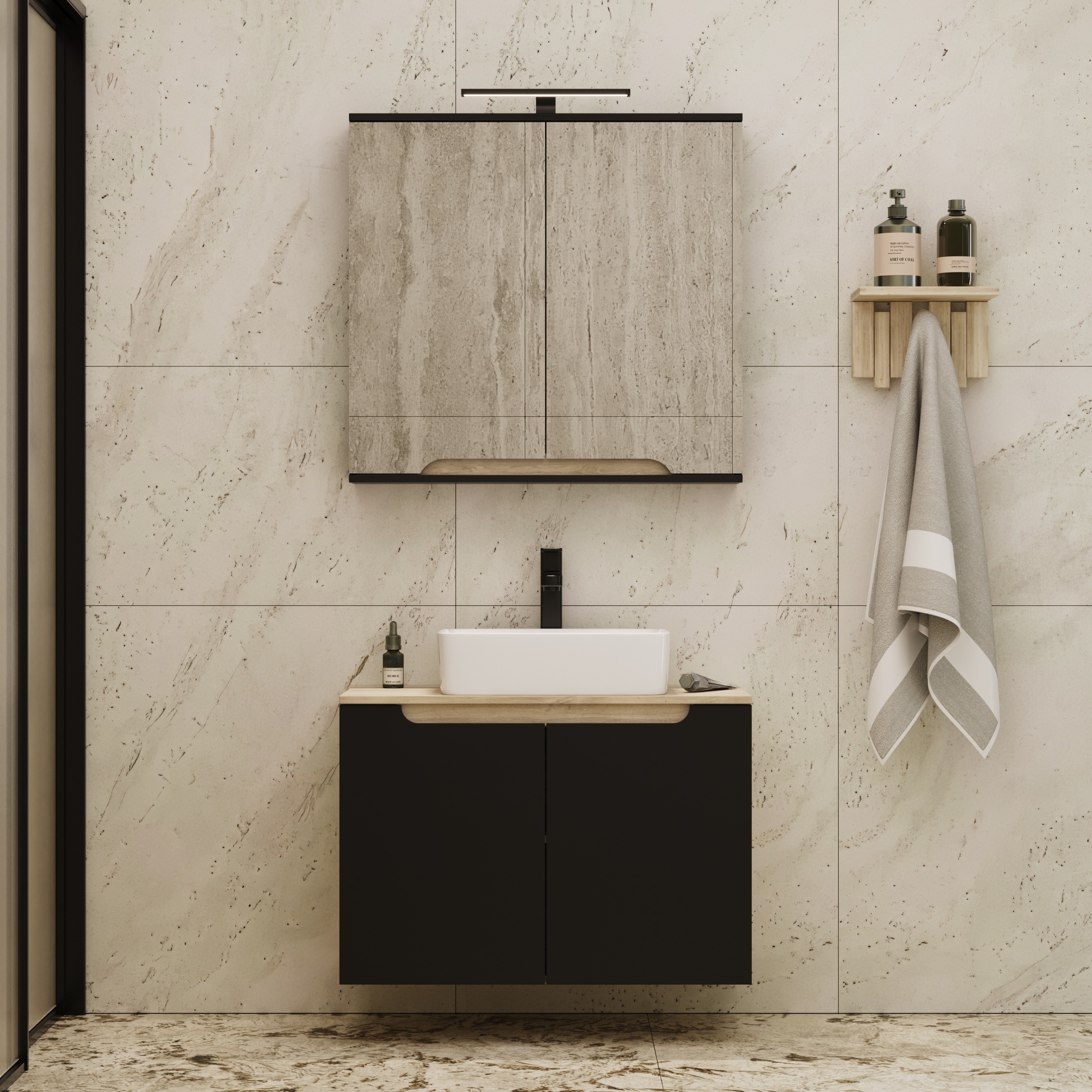 Konstrukcja pozwala zmontować mebel jako szafka pod umywalkę stojąca na nóżkach z naturalnego drzewa albo jako szafka łazienkowa podwieszana.